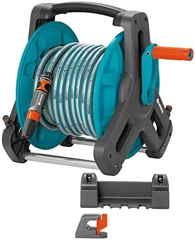 El soporte portamanguera le será muy útil allá donde usted lo necesite. Es especialmente idóneo para jardines de tamaño pequeño o mediano. Se maneja fácilmente con la manivela de rueda libre. También puede plegarse para ahorrar espacio. Se incluyen el soporte mural, tornillería e instrucciones de montaje. El montaje es extremadamente fácil. Un eje giratorio evita cualquier torsión de la manguera al enrollarse o desenrollarse. No se forman charcos por el agua derramada, ni se desperdicia agua. Los laterales del soporte portamanguera poseen una estructura triangular y un centro de gravedad bajo